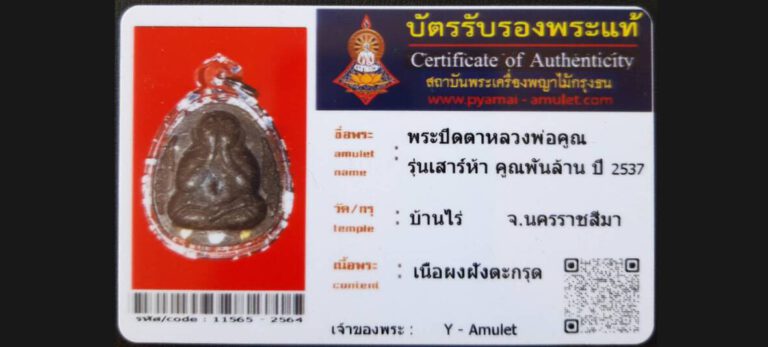 บัตรที่ผ่านการรับรองไม่มีหมวดหมู่ พระปิดตาหลวงพ่อคูณรุ่นเสาร์ห้า คุณพันล้าน วัดบ้านไร่ จ.นครราชสีมา เจ้าของพระ Y – Amulet รหัสบัตร 11565 – 2564