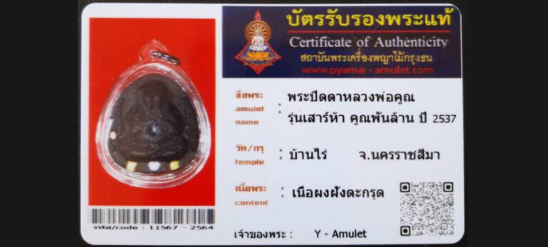 บัตรที่ผ่านการรับรองไม่มีหมวดหมู่ พระปิดตาหลวงพ่อคูณรุ่นเสาร์ห้า คุณพันล้าน วัดบ้านไร่ จ.นครราชสีมา เจ้าของพระ Y – Amulet รหัสบัตร 11567 – 2564