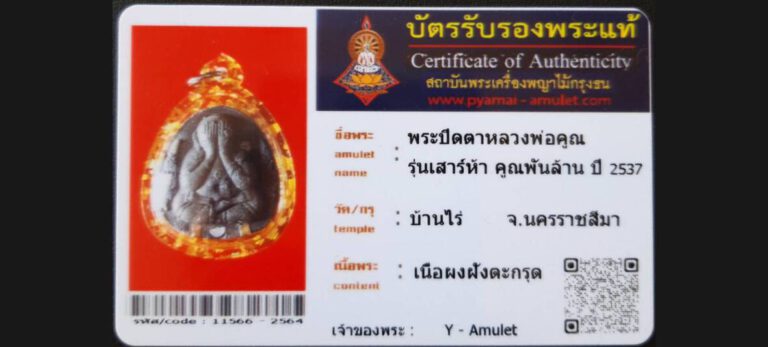 บัตรที่ผ่านการรับรองไม่มีหมวดหมู่ พระปิดตาหลวงพ่อคูณรุ่นเสาร์ห้า คุณพันล้าน วัดบ้านไร่ จ.นครราชสีมา เจ้าของพระ Y – Amulet รหัสบัตร 11566 – 2564