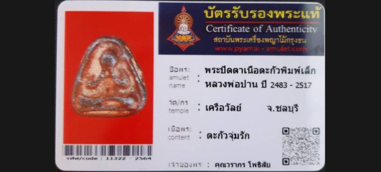 บัตรที่ผ่านการรับรองไม่มีหมวดหมู่ พระปิดตาเนื้อตะกั่วพิมพ์เล็ก หลวงพ่อปาน วัดเครือวัลย์ จ.ชลบุรี เจ้าของพระ คุณวรากร โพธิสัย รหัสบัตร 11322- 2564
