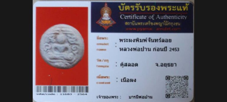 บัตรที่ผ่านการรับรองไม่มีหมวดหมู่ พระผงพิมพ์จันทร์ลอย หลวงพ่อปาน วัดคู้สลอด จ.อยุธยา เจ้าของพระ บารมีพ่อปาน รหัสบัตร 11683 – 2564