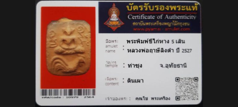บัตรที่ผ่านการรับรองไม่มีหมวดหมู่ พระพิมพ์ขี่ไก่หาง 5 เส้น หลวงพ่อฤาษีลิงดำ วัดท่าซุง จ.อุทัยธานี เจ้าของพระ คุณโช พระเครื่อง รหัสบัตร 10979 – 2564