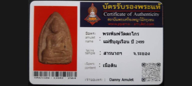 บัตรที่ผ่านการรับรองไม่มีหมวดหมู่ พระพิมพ์วัดตะไกร แม่ชีบุญเรือน วัดสารนาถฯ จ.ระยอง เจ้าของพระ Danny Amulet รหัสบัตร 11043 – 2564