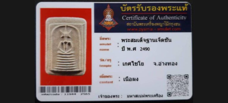 บัตรที่ผ่านการรับรองไม่มีหมวดหมู่ พระสมเด็จฐานเจ็ดชั้น วัดเกศไชโย จ.อ่างทอง เจ้าของพระ มหาเสน่ห์พระเครือง รหัสบัตร 11944 – 2565
