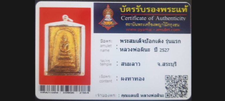 บัตรที่ผ่านการรับรองไม่มีหมวดหมู่ พระสมเด็จป้อกเด้ง รุ่นแรก หลวงพ่อผินะ วัดสนมลาว จ.สระบุรี เจ้าของพระ คุณแดนนี้ หลวงพ่อผินะ รหัสบัตร 10806 – 2564