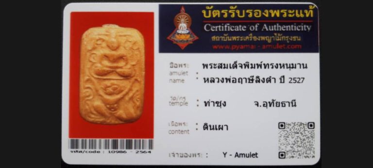 บัตรที่ผ่านการรับรองไม่มีหมวดหมู่ พระสมเด็จพิมพ์ทรงหนุมาน หลวงพ่อฤาษีลิงดำ วัดท่าซุง จ.อุทัยธานี เจ้าของพระ Y – Amulet รหัสบัตร 10986 – 2564