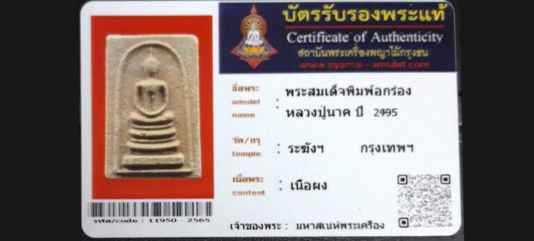 บัตรที่ผ่านการรับรองไม่มีหมวดหมู่ พระสมเด็จพิมพ์อกร่อง หลวงปู่นาค วัดระฆังฯ กรุงเทพฯ เจ้าของพระ มหาเสน่ห์พระเครือง รหัสบัตร 11950 – 2565