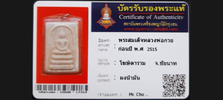 บัตรที่ผ่านการรับรองไม่มีหมวดหมู่ พระสมเด็จหลวงพ่อกวย ก่อนปี พ.ศ 2515 วัดโฆษิตารา จ.ชัยนาท เจ้าของพระ Mr.Cho.. รหัสบัตร 10608 – 17764