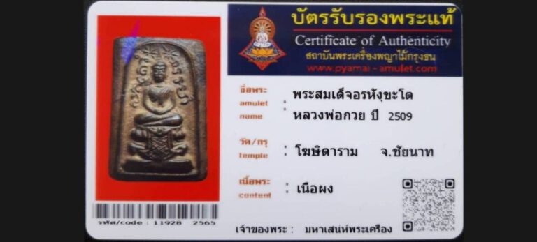 บัตรที่ผ่านการรับรองไม่มีหมวดหมู่ พระสมเด็จอรหังขะโต หลวงพ่อกวย วัดโฆษิตาราม จ.ชัยนาท เจ้าของพระ มหาเสน่ห์พระเครือง รหัสบัตร 11928 – 2565