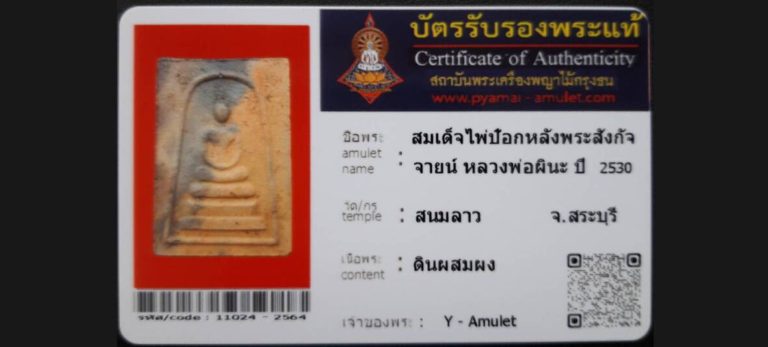 บัตรที่ผ่านการรับรองไม่มีหมวดหมู่ พระสมเด็จไพ่ป้อกหลังพระสังกัจจายน์ หลวงพ่อผินะ วัดสนมลาว จ.สระบุรี เจ้าของพระ Y – Amulet รหัสบัตร 11024 – 2564