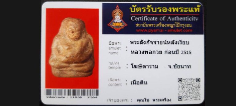 บัตรที่ผ่านการรับรองไม่มีหมวดหมู่ พระสังกัจจายน์หลังเลียบ หลวงพ่อกวย วัดโฆษิตาราม จ.ชัยนาท เจ้าของพระ คุณโช พระเครื่อง รหัสบัตร 11056 – 2564
