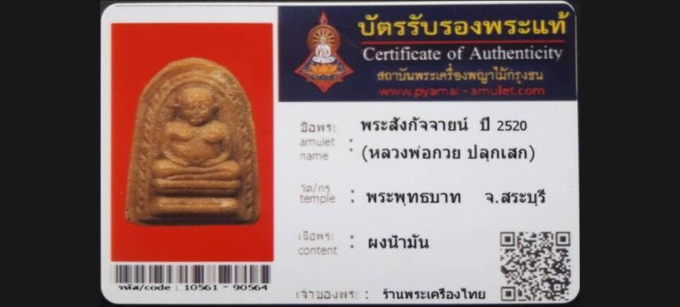 บัตรที่ผ่านการรับรองไม่มีหมวดหมู่ พระสังกัจจายน์ ปี2520 (หลวงพ่อกวย ปลุกเสก) วัดพระพุทธบาท จ.สระบุรี เจ้าของพระ ร้านพระเครื่องไทย รหัสบัตร 10561 – 2564