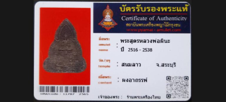 บัตรที่ผ่านการรับรองไม่มีหมวดหมู่ พระสูตรหลวงพ่อผินะ วัดสนมลาว จ.สระบุรี เจ้าของพระ ร้านพระเครื่องไทย รหัสบัตร 11787 – 2565
