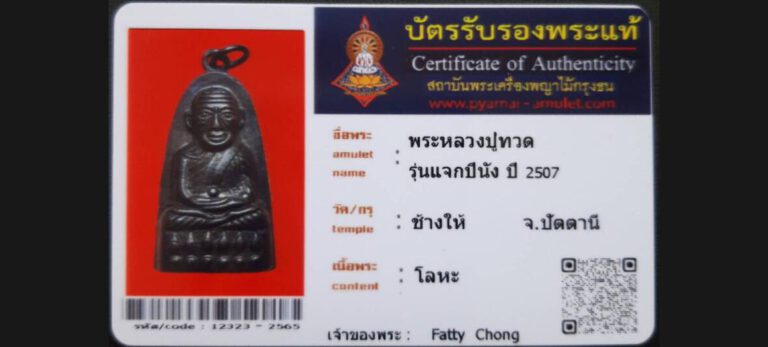 บัตรที่ผ่านการรับรองไม่มีหมวดหมู่ พระหลวงปู่ทวด รุ่นแจกปีนัง วัดช้างให้ จ.ปัตตานี เจ้าของพระ Fatty Chong รหัสบัตร 12323 – 2565
