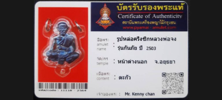 บัตรที่ผ่านการรับรองไม่มีหมวดหมู่ รูปหล่อครึ่งซึกหลวงพ่อจง รุ่นกันภัย วัดหน้าต่างนอก จ.อยุธยา เจ้าของพระ Mr.Kenny Chan รหัสบัตร 11118 – 2564