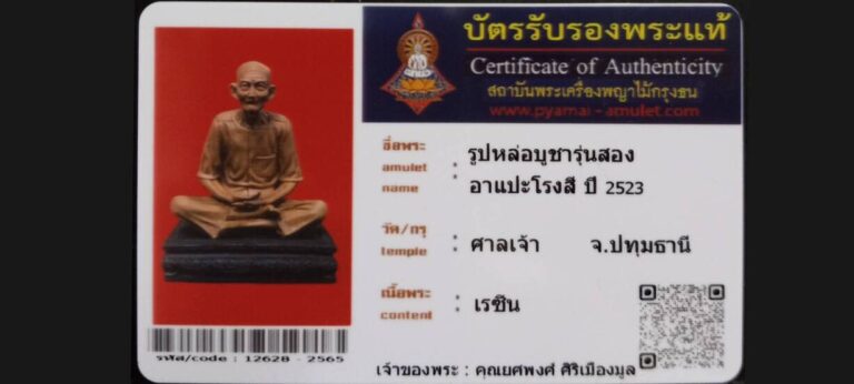 บัตรที่ผ่านการรับรอง (ซ่อน) รูปหล่อบูชารุ่นสอง อาแปะโรงสี วัดศาลเจ้า จ.ปทุมธานี เจ้าของพระ คุณยศพงศ์ ศิริเมืองมูล รหัสบัตร 12628 – 2565