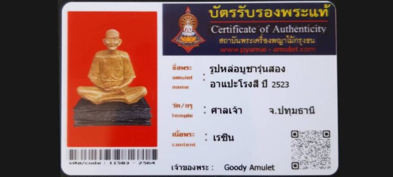 บัตรที่ผ่านการรับรอง (ซ่อน) รูปหล่อบูชารุ่นสอง อาแปะโรงสี วัดศาลเจ้า จ.ปทุมธานี เจ้าของพระ Goody Amulet รหัสบัตร 11583 – 2564
