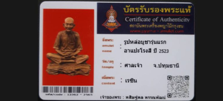 บัตรที่ผ่านการรับรอง (ซ่อน) รูปหล่อบูชารุ่นแรก อาแปะโรงสี วัดศาลเจ้า จ.ปทุมธานี เจ้าของพระ คุณพสิษฐ์พล พรรณรัตน์ รหัสบัตร 12362 – 2565