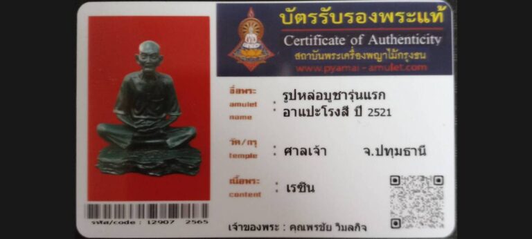 บัตรที่ผ่านการรับรอง (ซ่อน) รูปหล่อบูชารุ่นแรก อาแปะโรงสี วัดศาลเจ้า จ.ปทุมธานี เจ้าของพระ คุณพรชัย วิมลกิจ รหัสบัตร 12907 – 2565