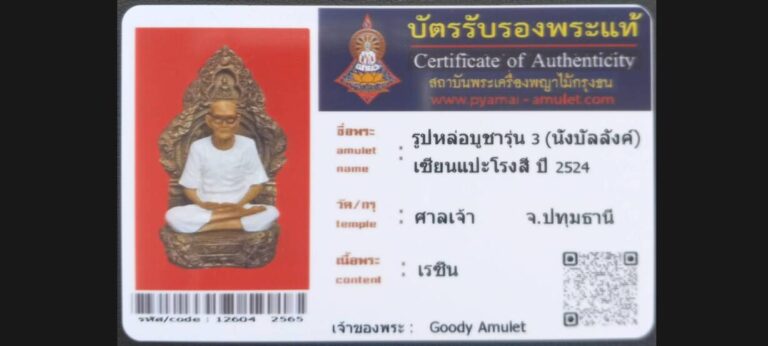 บัตรที่ผ่านการรับรอง (ซ่อน) รูปหล่อบูชารุ่น3นั่งบัลลังค์ อาแปะโรงสี วัดศาลเจ้า จ.ปทุมธานี เจ้าของพระ Goody Amulet รหัสบัตร 12604 – 2565