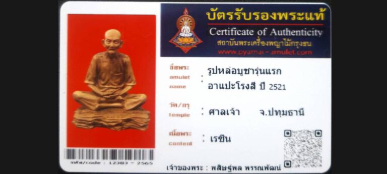 บัตรที่ผ่านการรับรอง (ซ่อน) รูปหล่อบูชารุ่นแรก อาแปะโรงสี วัดศาลเจ้า จ.ปทุมธานี เจ้าของพระ คุณพสิษฐ์พล พรรณพัฒน์ รหัสบัตร 12383 – 2565