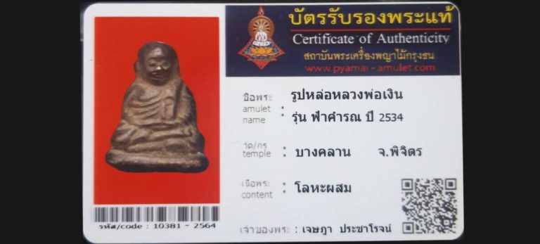 บัตรที่ผ่านการรับรองไม่มีหมวดหมู่ รูปหล่อหลวงพ่อเงิน รุ่นฟ้าคำรณ วัดบางคลาน จ.พิจิตร เจ้าของพระ คุณเจษฎา ประชาโรจน์ รหัสบัตร 10381 – 2564
