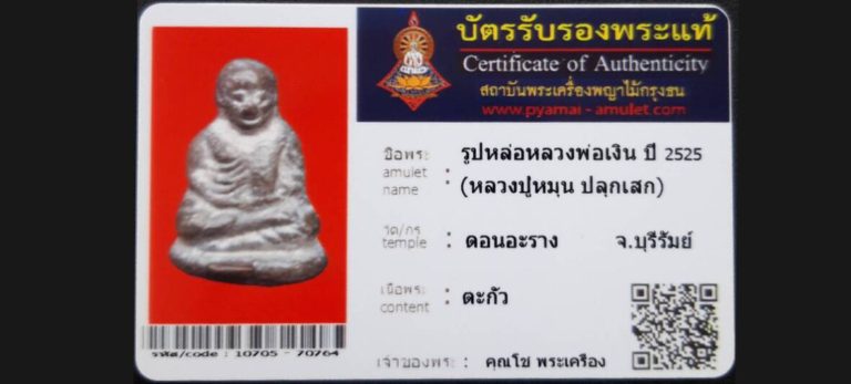 บัตรที่ผ่านการรับรองไม่มีหมวดหมู่ รูปหล่อหลวงพ่อเงิน (หลวงปู่หมุนปลุกเสก) วัดดอนอะราง จ.บุรีรัมย์ เจ้าของพระ คุณโช พระเครื่อง รหัสบัตร 10705 – 70764