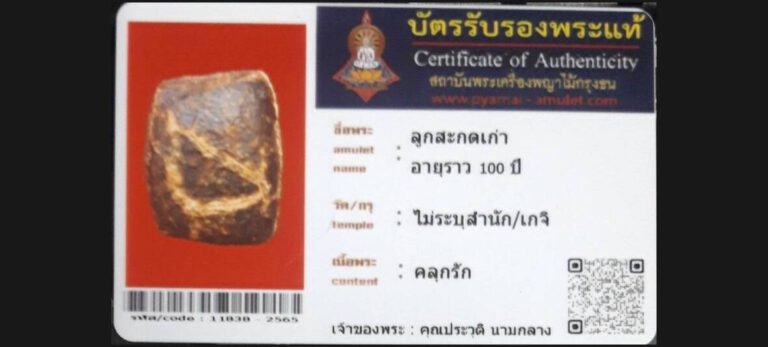 บัตรที่ผ่านการรับรองไม่มีหมวดหมู่ ลูกสะกดเก่า อายุราว 100 ปี ไม่ระบุสำนัก/เกจิ เจ้าของพระ ประวุฒิ นามกลาง รหัสบัตร 11838 – 2565