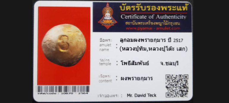 บัตรที่ผ่านการรับรองไม่มีหมวดหมู่ ลูกอมผงพรายกุมาร(หลวงปู่ทิม หลวงปู่โต๊ะ เสก) วัดโพธิ์สัมพันธ์ จ.ชลบุรี เจ้าของพระ Mr.David Teck รหัสบัตร 10870 – 2564