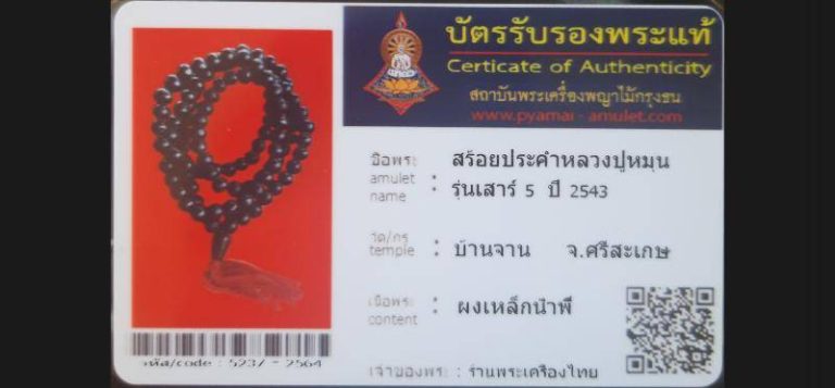 บัตรที่ผ่านการรับรองไม่มีหมวดหมู่ สร้อยประคำหลวงปุ่หมุน รุ่นเสาร์ 5 วัดบ้านจาน จ.ศรีสะเกษ เจ้าของพระ ร้านพระเครื่องไทย รหัสบัตร 5237 – 2564