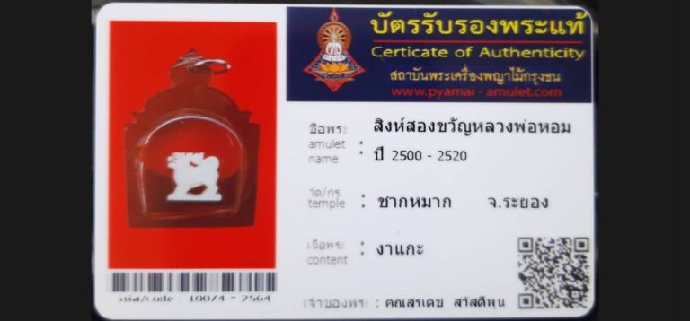 บัตรที่ผ่านการรับรองไม่มีหมวดหมู่ สิงห์สองขวัญ หลวงพ่อหอม วัดชากหมาก จ.ระยอง เจ้าของพระ คุณสุรเดช สวัสดีพูน รหัสบัตร 10074 – 2564
