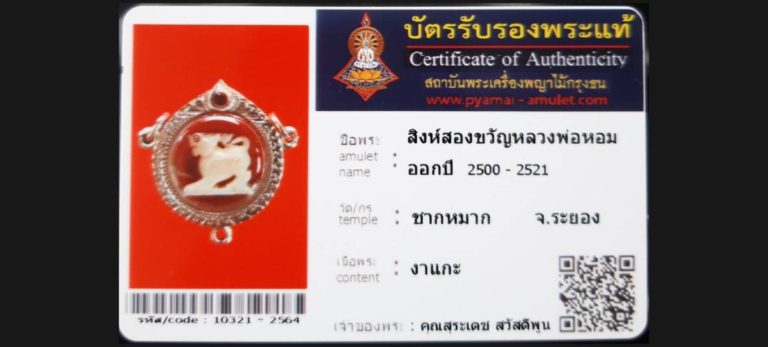 บัตรที่ผ่านการรับรองไม่มีหมวดหมู่ สิงห์สองขวัญ หลวงพ่อหอม วัดชากหมาก จ.ระยอง เจ้าของพระ คุณสุรเดช สวัสดีพูน รหัสบัตร 10321 – 2564