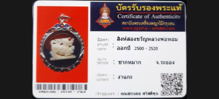 บัตรที่ผ่านการรับรองไม่มีหมวดหมู่ สิงห์สองขวัญ หลวงพ่อหอม วัดชากหมาก จ.ระยอง เจ้าของพระ คุณสุรเดช สวัสดีพูน รหัสบัตร 10330 – 2564