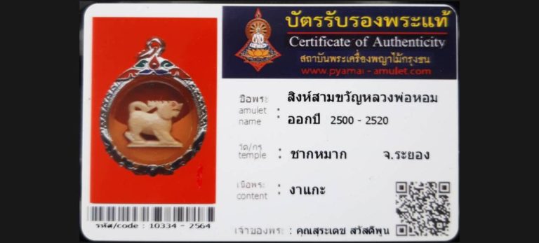 บัตรที่ผ่านการรับรองไม่มีหมวดหมู่ สิงห์สามขวัญ หลวงพ่อหอม วัดชากหมาก จ.ระยอง เจ้าของพระ คุณสุรเดช สวัสดีพูน รหัสบัตร 10334 – 2564