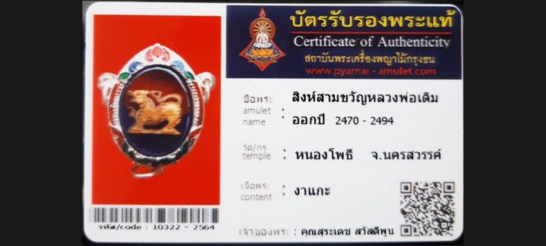 บัตรที่ผ่านการรับรองไม่มีหมวดหมู่ สิงห์สามขวัญ หลวงพ่อเดิม วัดหนองโพธิ์ จ.นครสวรรค์ เจ้าของพระ คุณสุรเดช สวัสดีพูน รหัสบัตร 10322 – 2564