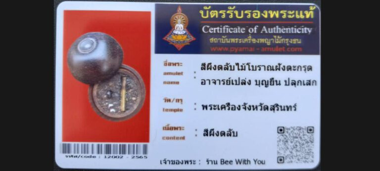 บัตรที่ผ่านการรับรองไม่มีหมวดหมู่ สีผึ้งตลับไม้โบราณฝังตะกรุด อาจารย์เปล่ง บุญยืน ปลุกเสก พระเครื่องจังหวัดสุรินทร์ เจ้าของพระ ร้าน Bee With You รหัสบัตร 12002 – 2565