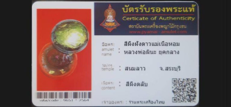บัตรที่ผ่านการรับรองไม่มีหมวดหมู่ สีผึ้งฝังดาวแม่เนื้อหอม หลวงพ่อผินะ ยุคกลาง วัดสนมลาว จ.สระบุรี เจ้าของพระ ร้านพระเครื่องไทย รหัสบัตร 9651 – 2564