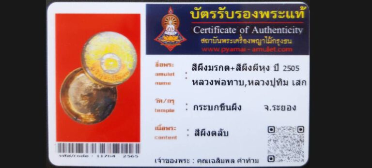 บัตรที่ผ่านการรับรองไม่มีหมวดหมู่ สีผึ้งมรกต + สีผึ้งผีหุง หลวงพ่อทาบ หลวงปู่ทิม เสก วัดกระบกขึ้นผึ้ง จ.ระยอง เจ้าของพระ คุณเฉลิมพล คำท้วม รหัสบัตร 11784 – 2565