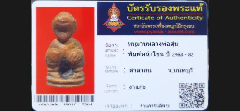 บัตรที่ผ่านการรับรองไม่มีหมวดหมู่ หนุมาน หลวงพ่อสุ่น พิมพ์หน้าโขน วัดศาลากุน จ.นนทบุรี เจ้าของพระ ร้านการันตีพระ รหัสบัตร 10017 – 2564