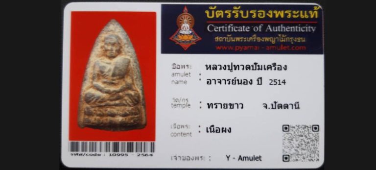 บัตรที่ผ่านการรับรองไม่มีหมวดหมู่ หลวงปู่ทวดปั้มเครือง อาจารย์นอง วัดทรายขาว จ.ปัตตานี เจ้าของพระ Y – Amulet รหัสบัตร 10995 – 2564