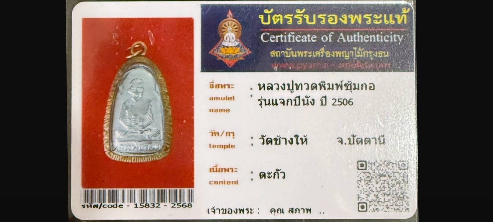 ไม่มีหมวดหมู่ หลวงปู่ทวดพิมพ์ซุ้มกอ รุ่นแจกปีนัง วัดช้างให้ จ.ปัตตานี เจ้าของพระ คุณสุภาพ รหัสบัตร 15832-2568