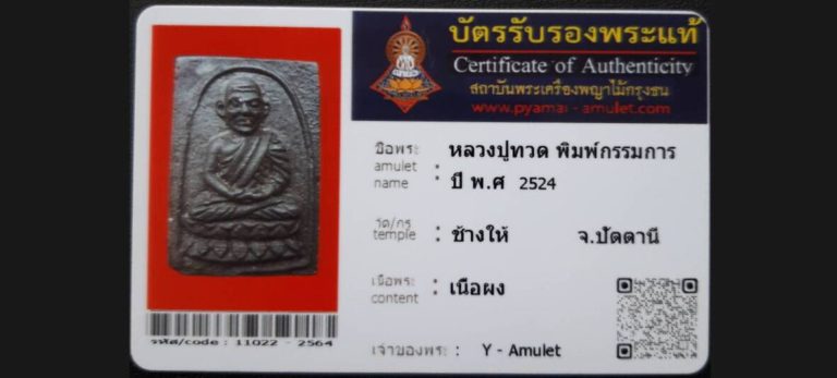 บัตรที่ผ่านการรับรองไม่มีหมวดหมู่ หลวงปู่ทวด พิมพ์กรรมการ วัดช้างให้ จ.ปัตตานี เจ้าของพระ Y – Amulet รหัสบัตร 11022 – 2564