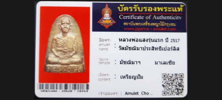 บัตรที่ผ่านการรับรองไม่มีหมวดหมู่ หลวงพ่อแสง รุ่นแรก ปี2517 วัดมัชฌิมาประสิทธิ์เปอร์ลิส วัดมัชฌิมาฯ มาเลเซีย เจ้าของพระ Amulet Cho.. รหัสบัตร 10628 – 18764