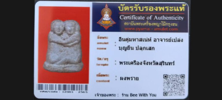 บัตรที่ผ่านการรับรองไม่มีหมวดหมู่ อิมคู่มหาสเน่ห์ อาจารย์เปล่ง บุญยืน ปลุกเสก พระเครื่องจังหวัดสุรินทร์ เจ้าของพระ ร้าน Bee With You รหัสบัตร 12001 – 2565