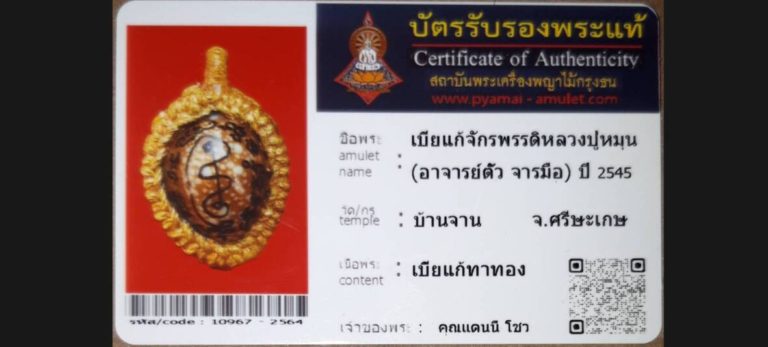 บัตรที่ผ่านการรับรองไม่มีหมวดหมู่ เบี้ยแก้จักรพรรดิหลวงปู่หมุน (อาจารย์ตัว จารมือ) วัดบ้านจาน จ.ศรีษะเกษ เจ้าของพระ คุณแดนนี้ โซว รหัสบัตร 10967 – 2564