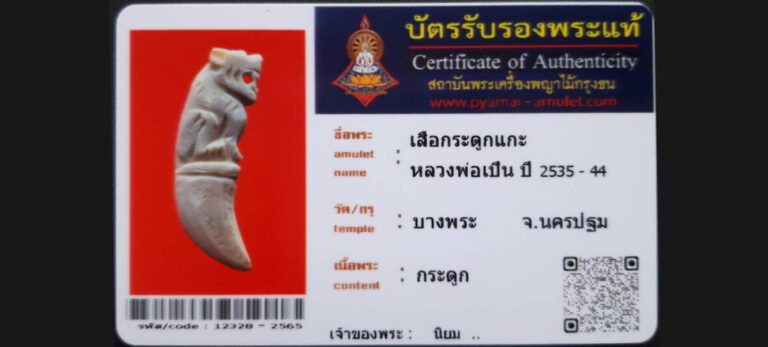 บัตรที่ผ่านการรับรองไม่มีหมวดหมู่ เสือกระดูกแกะ หลวงพ่อเปิ่น วัดบางพระ จ.นครปฐม เจ้าของพระ นิยม รหัสบัตร 12328 – 2565