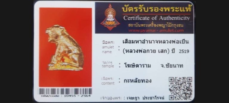 บัตรที่ผ่านการรับรองไม่มีหมวดหมู่ เสือมหาอำนาจหลวงพ่อเปิ่น(หลวงพ่อกวย เสก) วัดโฆษิตาราม จ.ชัยนาท เจ้าของพระ คุณเจษฎา ประชาโรจน์ รหัสบัตร 10455 – 2564อ