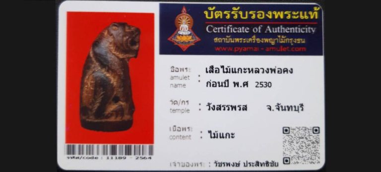 บัตรที่ผ่านการรับรองไม่มีหมวดหมู่ เสือไม้แกะหลวงพ่อคง วัดวังสรรพรส จ.จันทบุรี เจ้าของพระ คุณวัชรพงษ์ ทองประสิทธิ รหัสบัตร 11189 – 2564