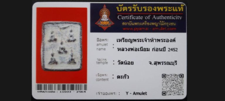 บัตรที่ผ่านการรับรองไม่มีหมวดหมู่ เหรียญพรเจ้าห้าพระองค์ หลวงพ่อเนียม วัดน้อย จ.สุพรรณบุรี เจ้าของพระ Y – Amulet รหัสบัตร 11033 – 2564