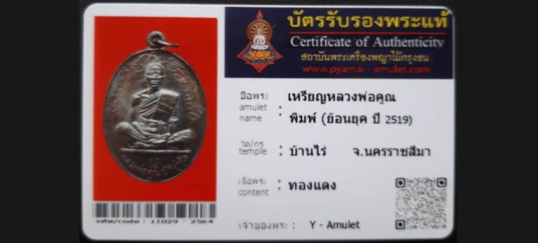 บัตรที่ผ่านการรับรองไม่มีหมวดหมู่ เหรียญหลวงพ่อคูณ พิมพ์ย้อนยุค วัดบ้านไร จ.นครราชสีมา เจ้าของพระ Y – Amulet รหัสบัตร 11029 – 2564
